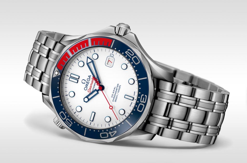 ベースモデルはオメガを代表するダイバーウォッチとして鉄板のシーマスター プロフェッショナル。ケース径は41mm。ブルーセラミック製ベゼルの最初の15分間のダイビングスケールはレッドラバーで彩られています。ポリッシュ仕上げのホワイトセラミック製ダイアルの鮮やかさと相まって、なんとも爽やかな佇まいです。なかなかここまで清涼感のある時計もありません。
